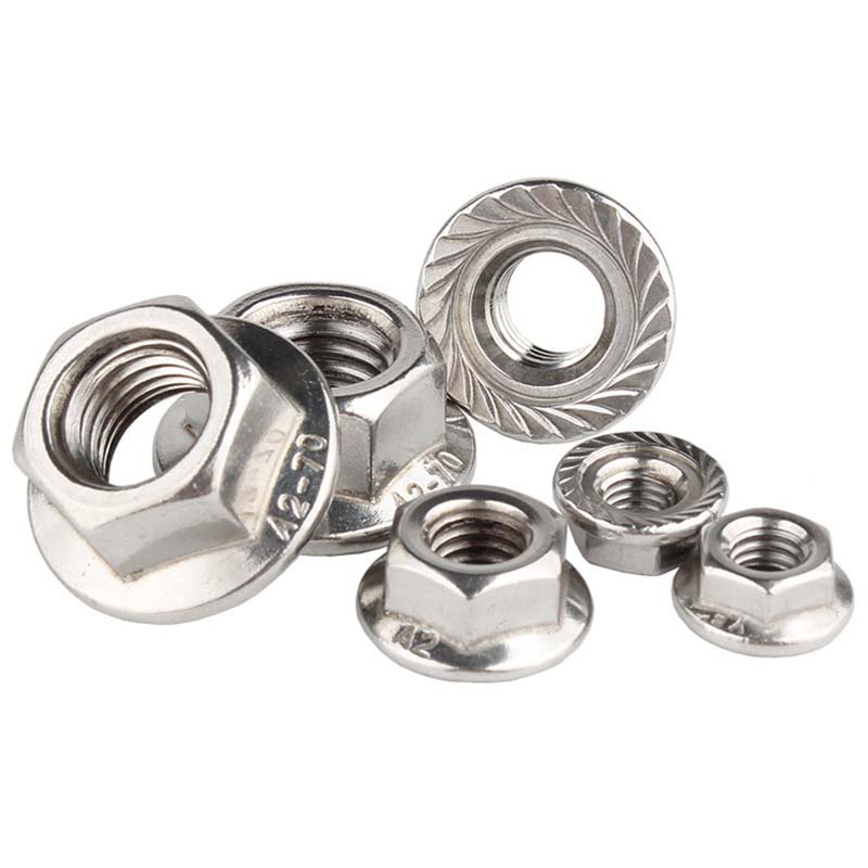 ถั่วหกเหลี่ยมที่มีหน้าแปลนมีหน้าแปลนเหมือนปะเก็นแล้วดังนั้นคุณสามารถขันให้เร็วขึ้นได้เร็วขึ้น ถั่วมีขนาดตั้งแต่ M3 ถึง M30 และครอบคลุมทุกอย่างตั้งแต่อุปกรณ์อิเล็กทรอนิกส์ขนาดเล็กไปจนถึงเครื่องจักรหนัก หน้าแปลนยังป้องกันไม่ให้น็อตหมุนหลังจากการติดตั้งซึ่งสะดวกมากสำหรับการทำงานที่ดี มองหาถั่วที่มีรูปร่างหกเหลี่ยมเรียบซึ่งง่ายต่อการจับด้วยเครื่องมือ การใช้งานทั่วไป ได้แก่ เฟรมจักรยานชิ้นส่วนเครื่องจักรกลและแม้แต่ขาเฟอร์นิเจอร์