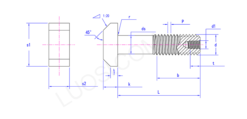 หัวของก้านก้านที่ลดลงด้วยรูคล้ายกับรูปสี่เหลี่ยมขนมเปียกปูนและสามารถติดอยู่ใน T-slot ที่จะได้รับการแก้ไขและไม่หมุน ส่วนตรงกลางของสกรูของมันกลายเป็นทินเนอร์นั่นคือ "ก้านหด" และรูก็ถูกเจาะที่ด้านล่างของสกรู การตกแต่งภายในเป็นกลวง