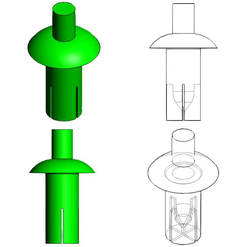 หมุดย้ำที่ปิดสนิทของแกนที่ปิดผนึกมีการออกแบบที่ไม่เหมือนใครรวมถึงเพลาแกนและแขนเสื้อ - โดยปกติแล้วพวกเขาจะมีหัวขนาดใหญ่และไม่เด่นซึ่งให้พื้นผิวที่มีแรงดันที่ดี ร่างกายหลักของพวกเขาได้รับการออกแบบมาเพื่อขยายเข้าไปในรูที่เจาะไว้ล่วงหน้าซึ่งจะช่วยให้การตรึงที่แน่นและปลอดภัย โดยการสังเกตเราสามารถตรวจสอบได้ว่ามีการติดตั้งผ่านโบลท์อย่างถูกต้องหรือไม่: เมื่อใช้แรงบางอย่างมันจะแตกหักอย่างหมดจดและเรียบร้อยนำเสนอรูปลักษณ์ที่เรียบร้อยและสวยงาม รูปร่างที่เฉพาะเจาะจงนี้ช่วยให้สามารถจับได้แน่นและไม่ได้มีแนวโน้มที่จะคลาย