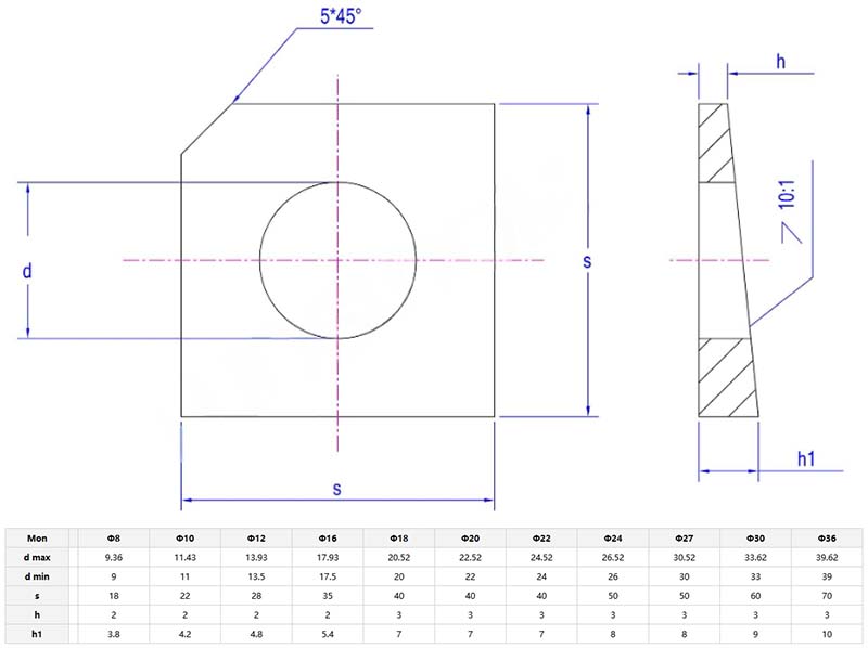 เครื่องซักผ้าแบบเอียงมีขนาดมาตรฐานและสามารถกำหนดเองเพื่อให้เหมาะกับความต้องการของโครงการที่แตกต่างกัน ขนาดมาตรฐานมีเส้นผ่านศูนย์กลางด้านในจาก 1/4 "ถึง 2" โดยมีความหนาระหว่าง 1.5 มม. ถึง 6 มม. ส่วนสี่เหลี่ยมจัตุรัสด้านนอกมักจะตรงกับขนาดหัวโบลต์ดังนั้นพวกเขาจึงทำงานร่วมกัน คุณสามารถรับรุ่นที่กำหนดเองด้วยมุมเอียงพิเศษหรือขนาดที่ใหญ่กว่าสำหรับงานหนัก พวกเขาให้รายละเอียดภาพวาดและสเป็คขนาดเพื่อให้แน่ใจว่าเครื่องซักผ้านั้นเข้ากันได้ดีกับระบบยึดที่มีอยู่
